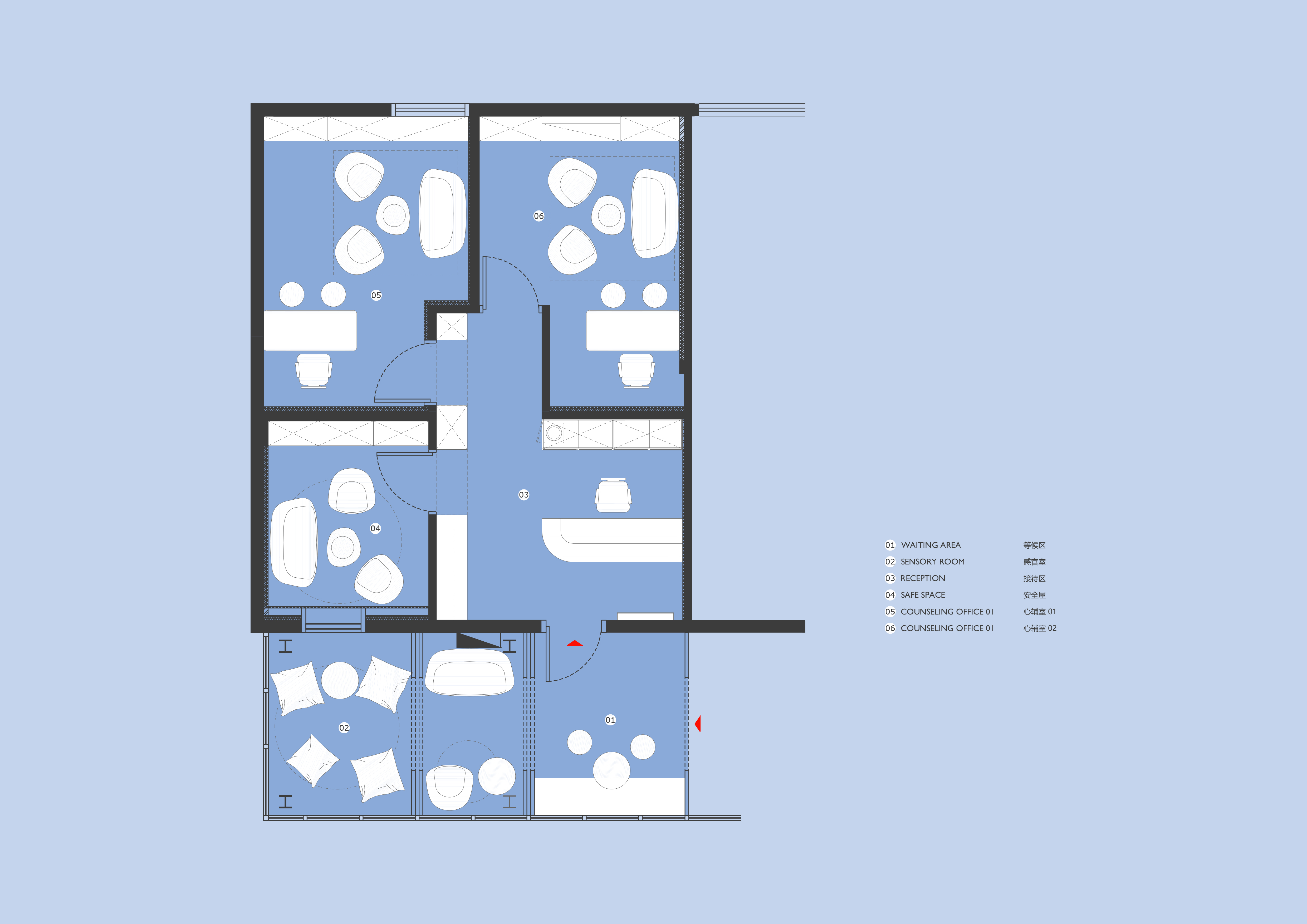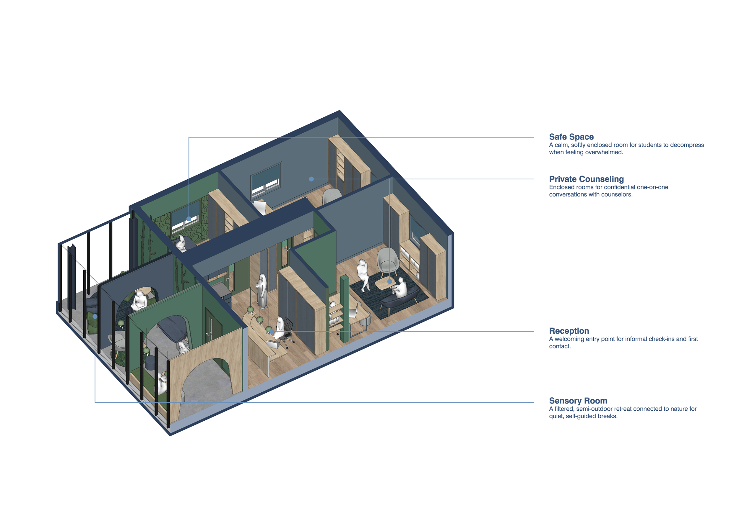 A place for students to pause, breathe, and reconnect. The counseling suite is designed as a small sanctuary within the Middle School — a space where conversations can unfold gently, and where students can find a moment of quiet away from the rhythm of the day. Forest colours and soft, layered textures set the tone. In rooms without windows, custom light panels shift throughout the day, evoking the feeling of natural daylight and helping create a sense of calm. The outer lounge, with its generous view into the trees, is shaped by a sequence of arches that frame the garden beyond. Soft seating and warm materials define this as a place to rest — a small refuge where looking out at nature becomes part of the healing process. A sequence of rooms designed to slow the pace, soften the atmosphere, and support the conversations that matter most.