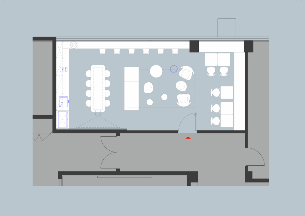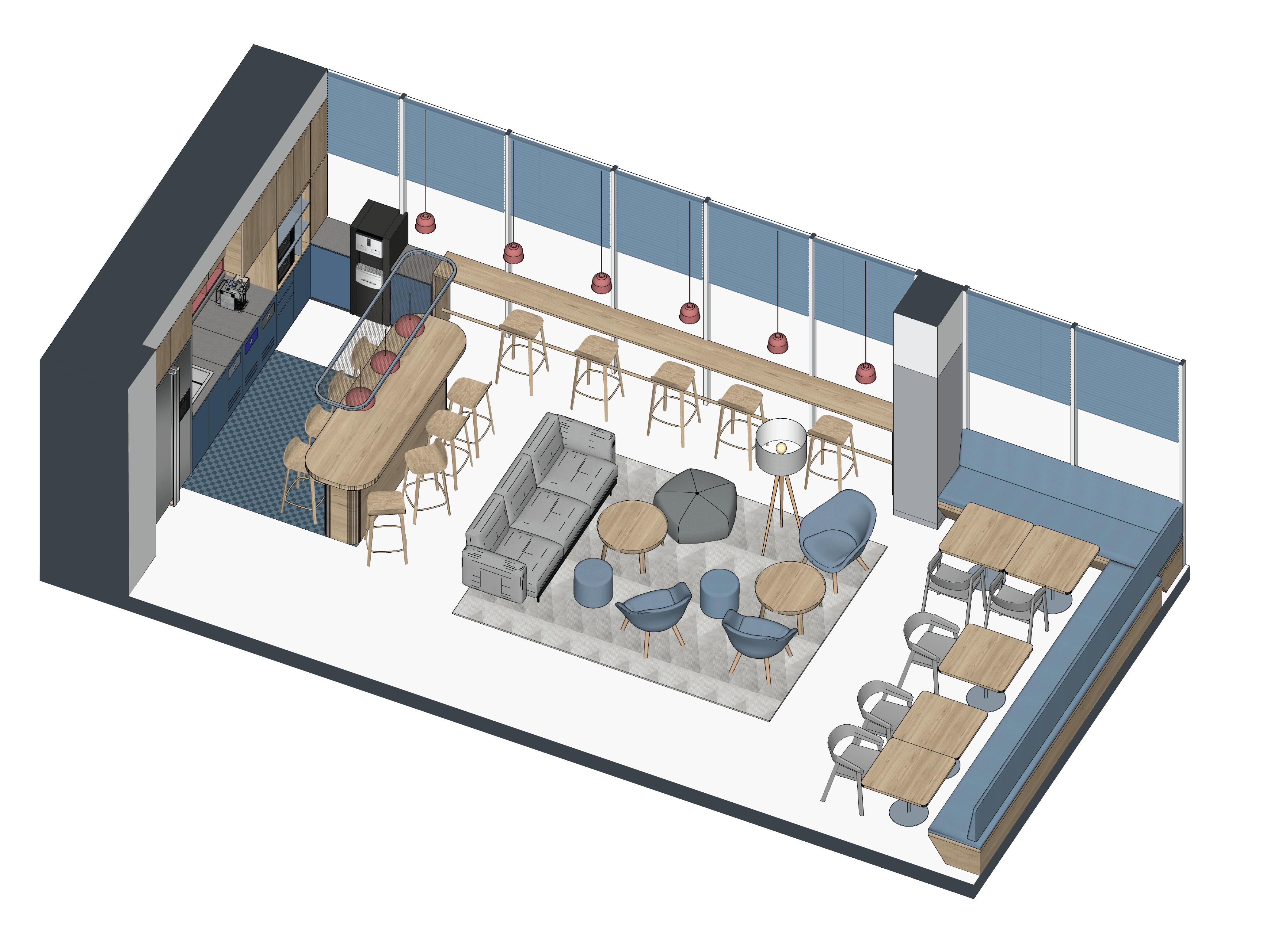 The room is organized into distinct seating areas to support different activities — a quick coffee and chat, catching up on emails, quiet relaxation, or a small meeting. The furniture layout offers flexibility, making it easy to adapt to the changing needs of the school day. The color palette combines soft greys and calming blues, accented with touches of pink for warmth and vibrancy. Thoughtful lighting and spatial planning make the compact space feel open and comfortable, while maintaining a sense of separation between different areas.