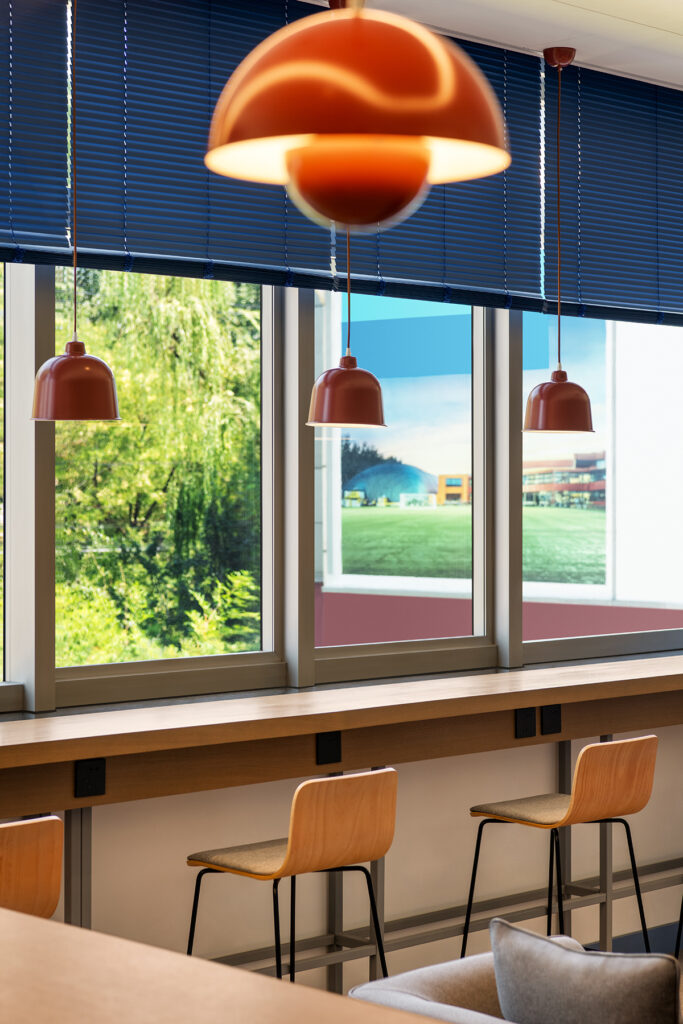 空间被划分为不同的座位区域,方便教师们在这里喝杯咖啡闲聊、处理邮件、安静休息,或进行小型会议。家具布局灵活多变,能够轻松适应一日中不同时间段的使用需求。