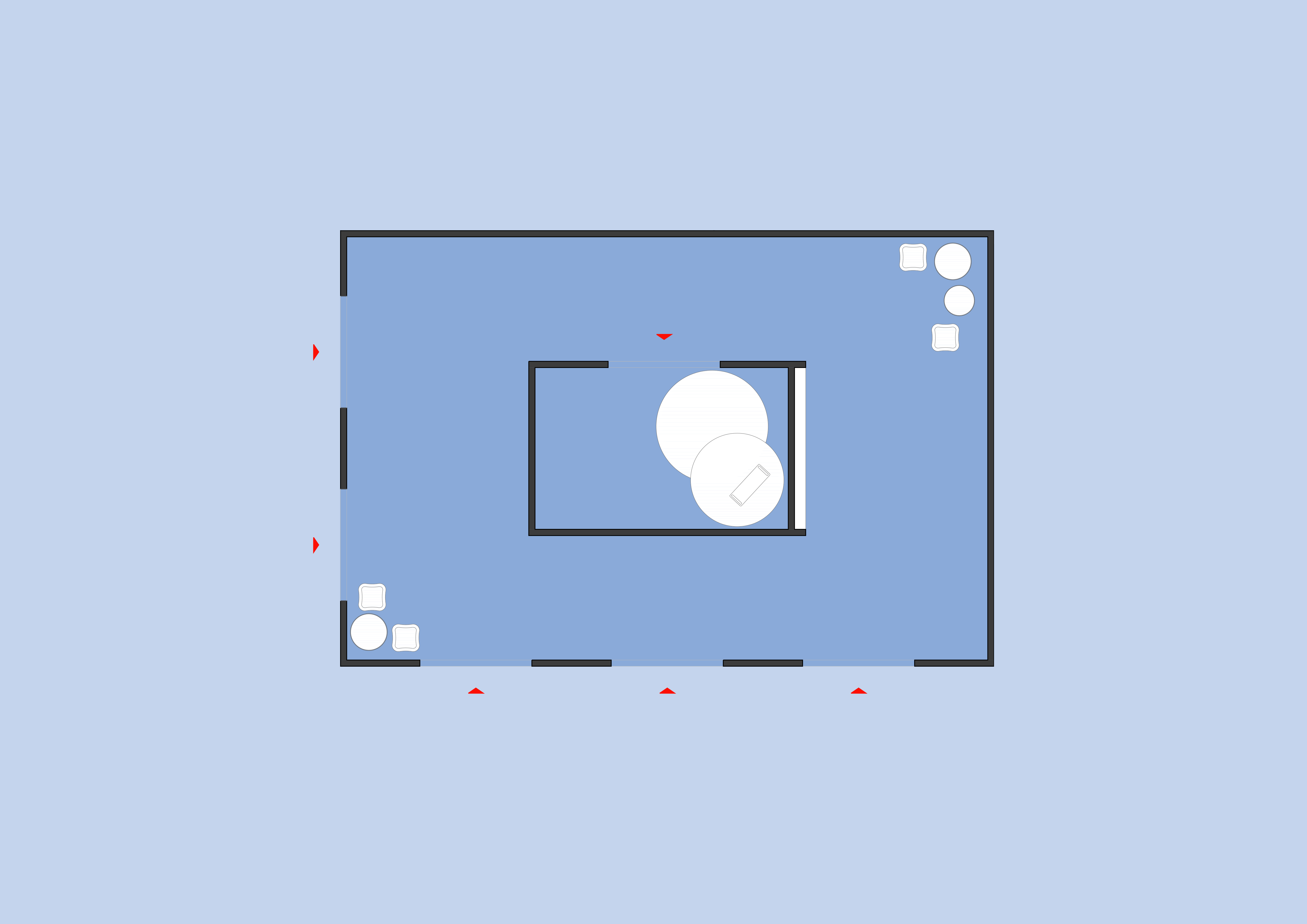 The exterior is defined by bold red arches and deep blue walls, creating a rhythmic, sculptural presence on the exhibition floor. As visitors move around the structure, they encounter shifting perspectives and unexpected compositions—until they find the entrance to a hidden room at its core.